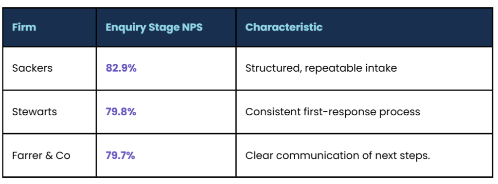 The firms that consistently sit at the other end of the spectrum share a common characteristic. They are not simply staffed with more attentive people. They operate structured, consistent intake processes. The ClearlyRated data highlights top performers including Stewarts, Sackers, and Farrer & Co, with enquiry-stage NPS scores of 79.8%, 82.9%, and 79.7% respectively.